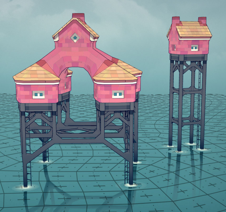 注:放置在脚手架之间的建筑物将变成平屋顶类型,并产生随机组合的灌木和其他物品。