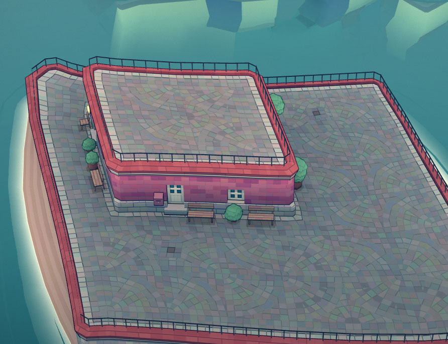 4.将成排的房屋地面镂空,可以减少两侧的门,增加两侧的植物和长椅,会有公园的感觉。