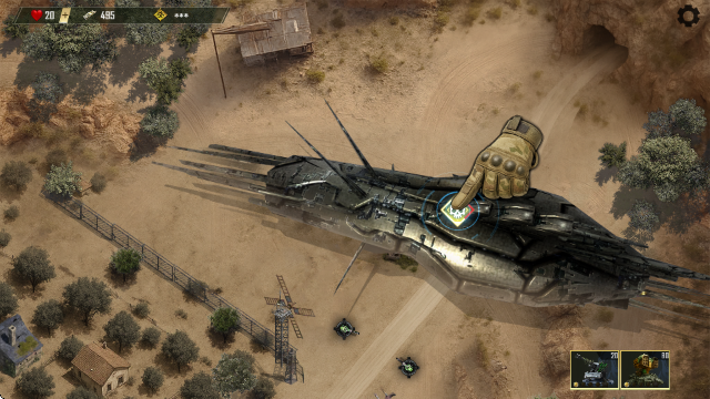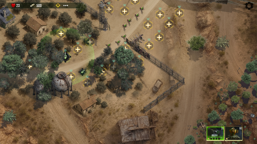 2.加载后进入关卡地图,可看到敌人进攻路线与可建造炮塔的空位,界面上方显示生命值、金币等资源。