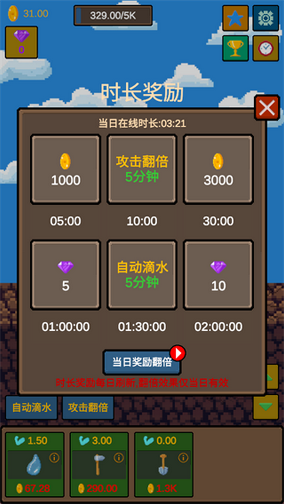 4.游戏具备放置机制,时长奖励每日刷新,翻倍效果仅当日有效,同样能积累成果。