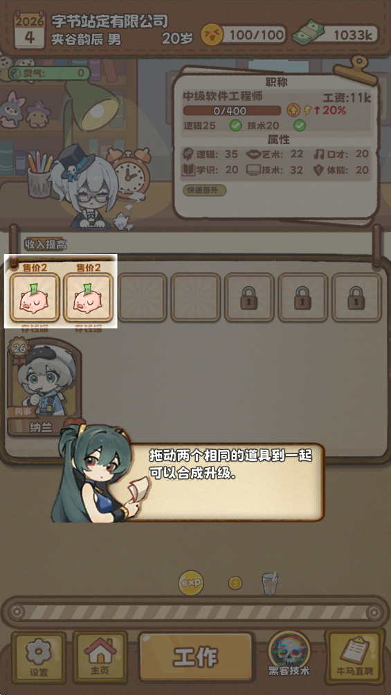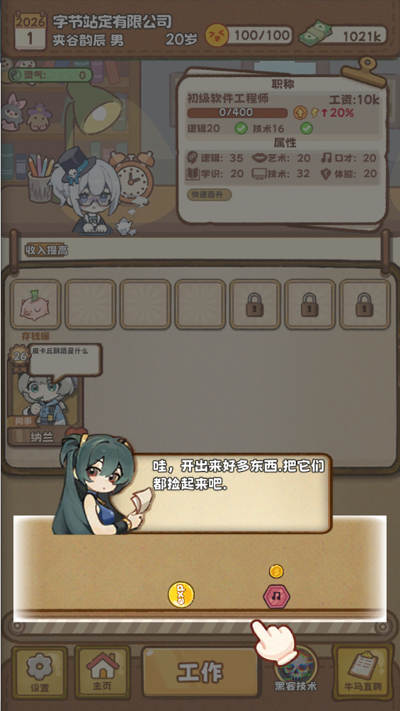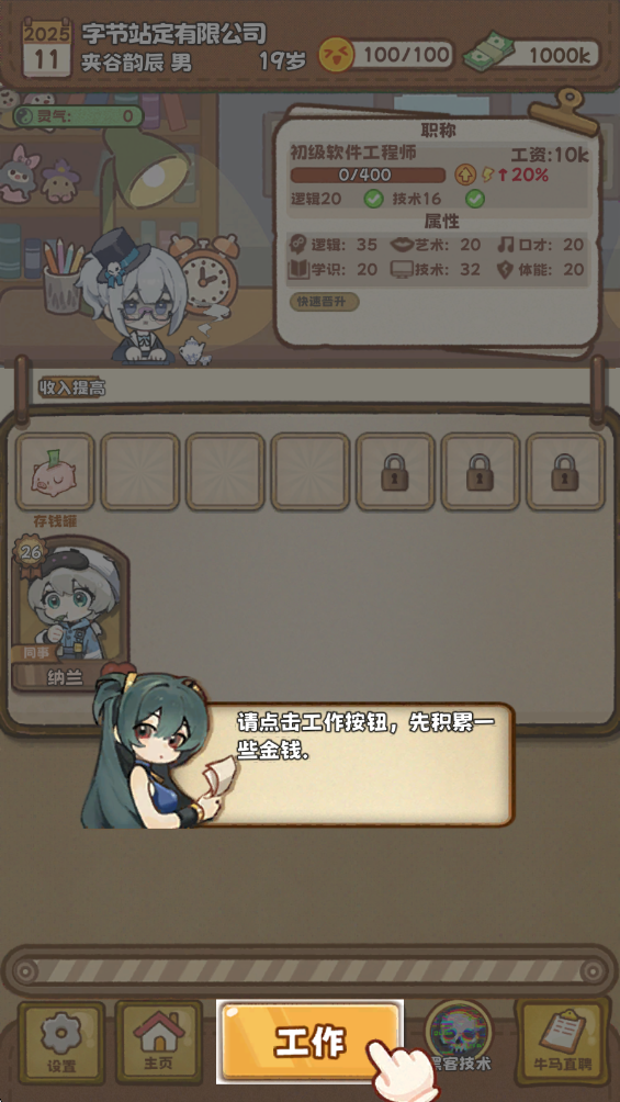 2.请点击工作按钮,先积累一些金钱,点击这里,购买一个盲盒。