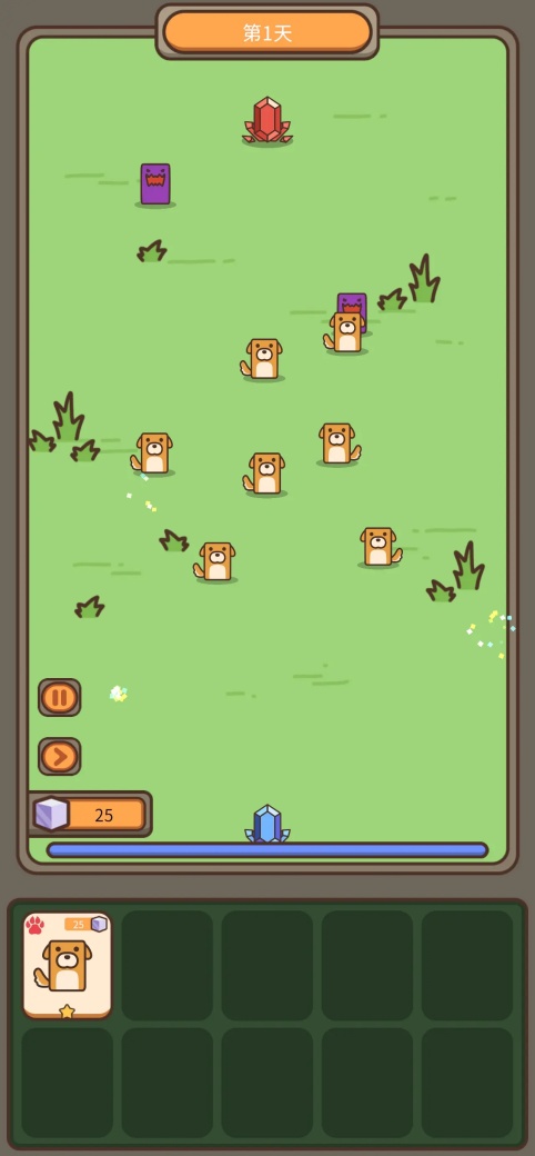 3.进入战斗界面(如第1天),动物会自动与紫色怪物等敌人战斗,需关注战斗进程,确保动物能成功击败敌人。