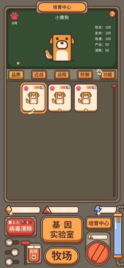 2.点击“培育中心”,可查看动物(如小黄狗)的属性(攻击、生命、攻速等),并进行动物培育相关操作,提升动物品质。