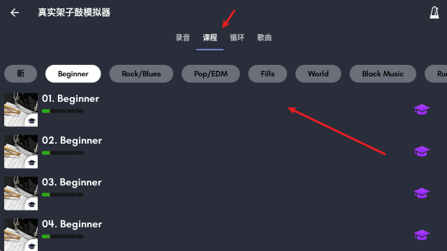 3.课程中,鼓上会出现特殊的颜色,跟随颜色来点击即可。