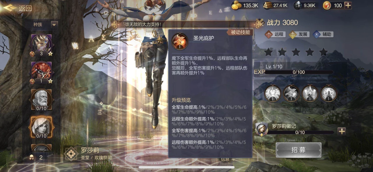 罗莉莎,首充礼包与VIP礼包获取的英雄,该英雄可以说是非常的全面。主动技能圣光之触,可以复活死亡单位并且进行治疗。如果配合上圣堂的天使与牧师兵种,能使整个队伍的生存能力大幅提高,并且被动技能也能全面的提升部队生存与输出能力。