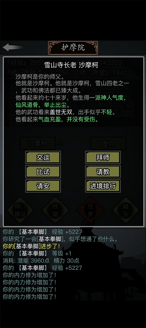 4.点击师傅后可以请安获得500贡献点,有月卡可以额外获得2000贡献点,点请教可以学习技能。