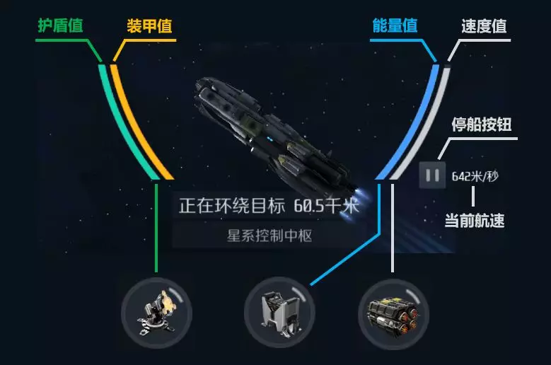 若想在战斗中获得胜利,除了学会使用武器以外,您还必须学会使用各种装置来维持自身舰船的护盾、能量和速度。