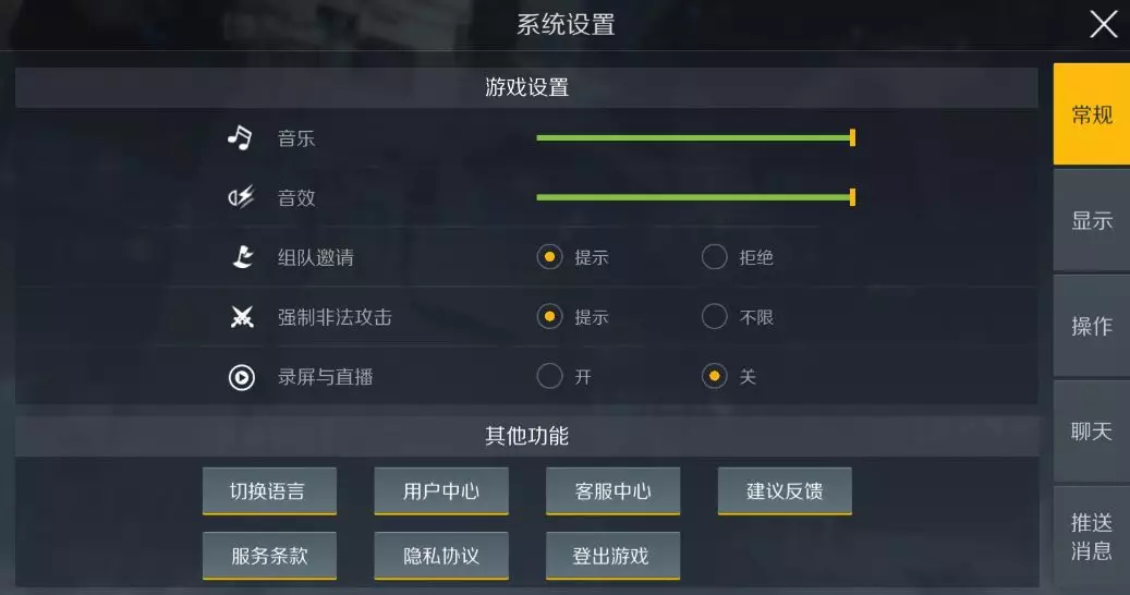 通过主菜单您可以进入“系统设置”功能,在这里您可以对游戏的渲染品质、音效音量、显示语言、聊天频道、推送消息等进行详细的设定。特别是当您觉得游戏运行不够流畅时,可以在“显示设置”中酌情降低显示帧率、贴图质量、特效质量和模型质量等选项。