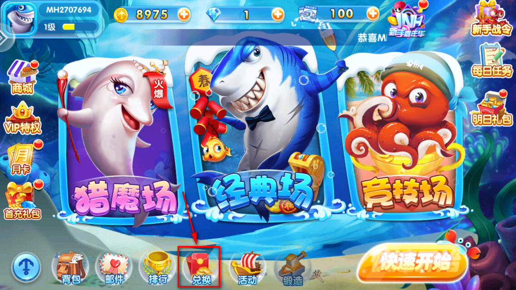 1、进入游戏点击快速开始即可立即进入渔场进行捕鱼