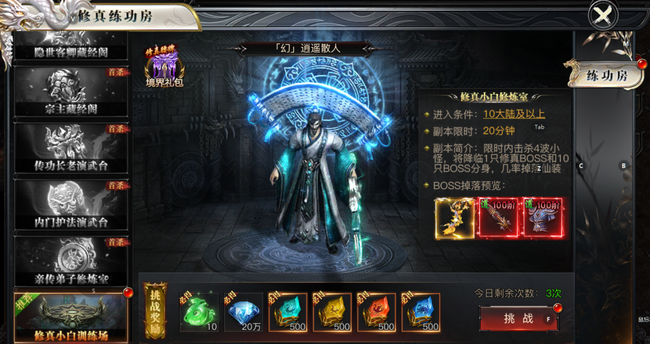 单人可闯“练功房”,刷取海量钻石和道具,给装备升级;有概率爆出高手装备,每天三次,每日必做副本!