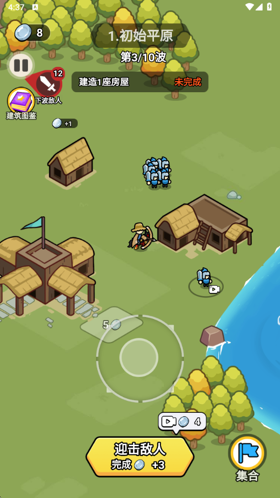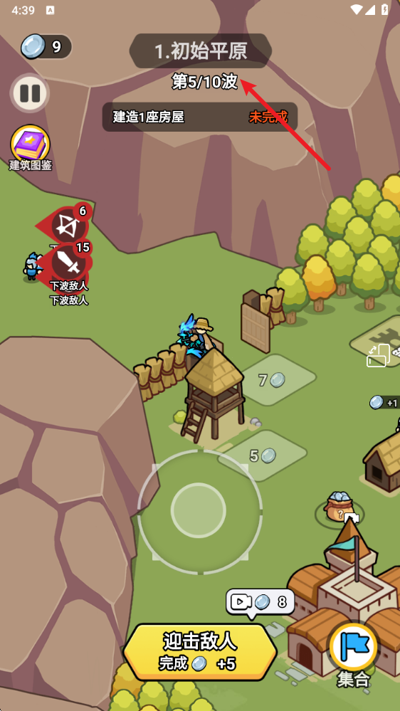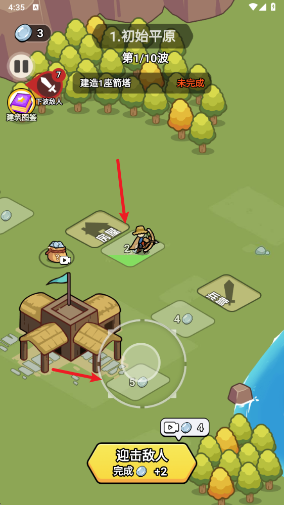 1、开始游戏后,拖动摇杆控制英雄移动,建造各种建筑。
