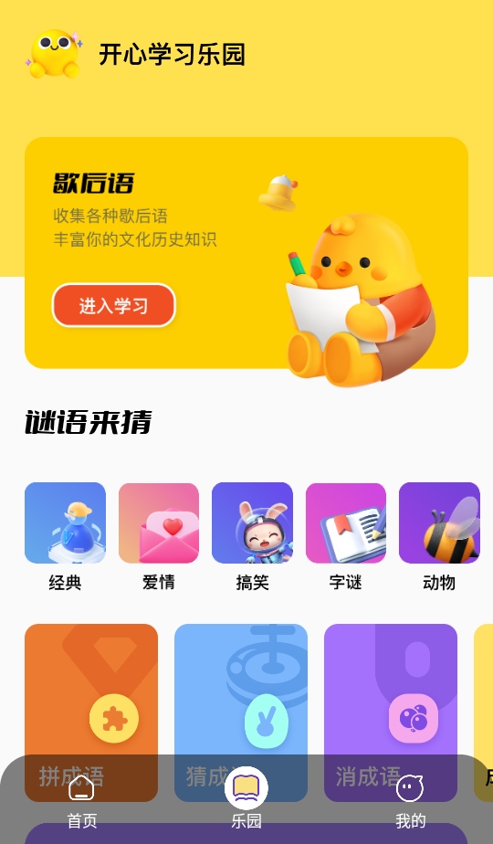 2、接着,在乐园页面,我们可以玩猜成语、拼成语、消成语等小游戏;