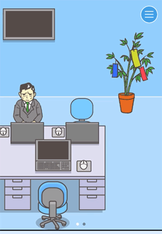 办公桌上拿到第一个晴天娃娃,在滑到右边,柜子里拿到锤子,到办公室敲碎裂缝,拿到第二个娃娃。到最右边把两个都挂上去,在点两个娃娃让它们倒过来。到办公室,打开窗户,拿到娃娃后到最右边挂上一样倒过来。最后回到办公室,老板假发会掉下来,拿钥匙。