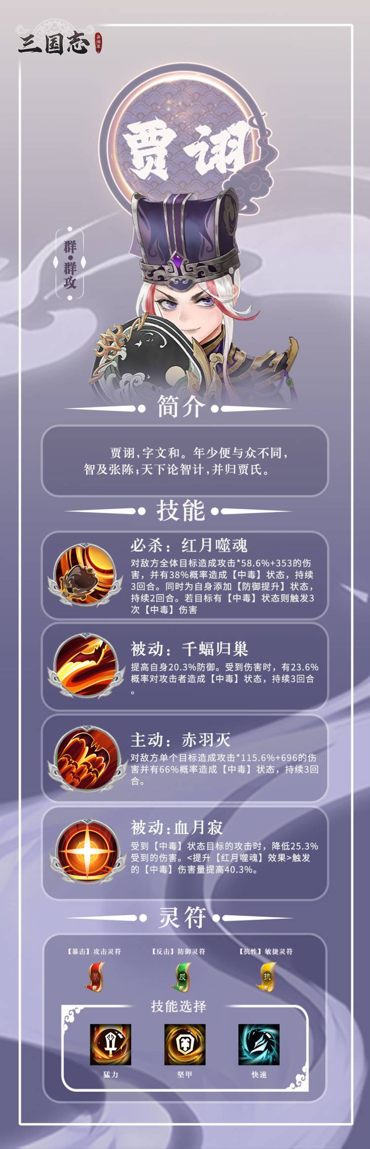 由于贾诩在团队中的作用是群攻,所以在灵符的选择上,优先选择【攻击灵符】、【敏捷灵符】、【防御灵符】。