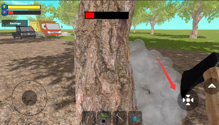 1、进入游戏后,先拿起工具开始砍树,为后续种植腾出空间。
