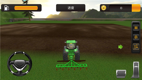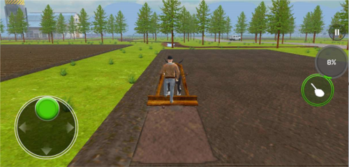 8、安装好后,根据箭头来到田边,行驶时按住右边的图标开始耕地。