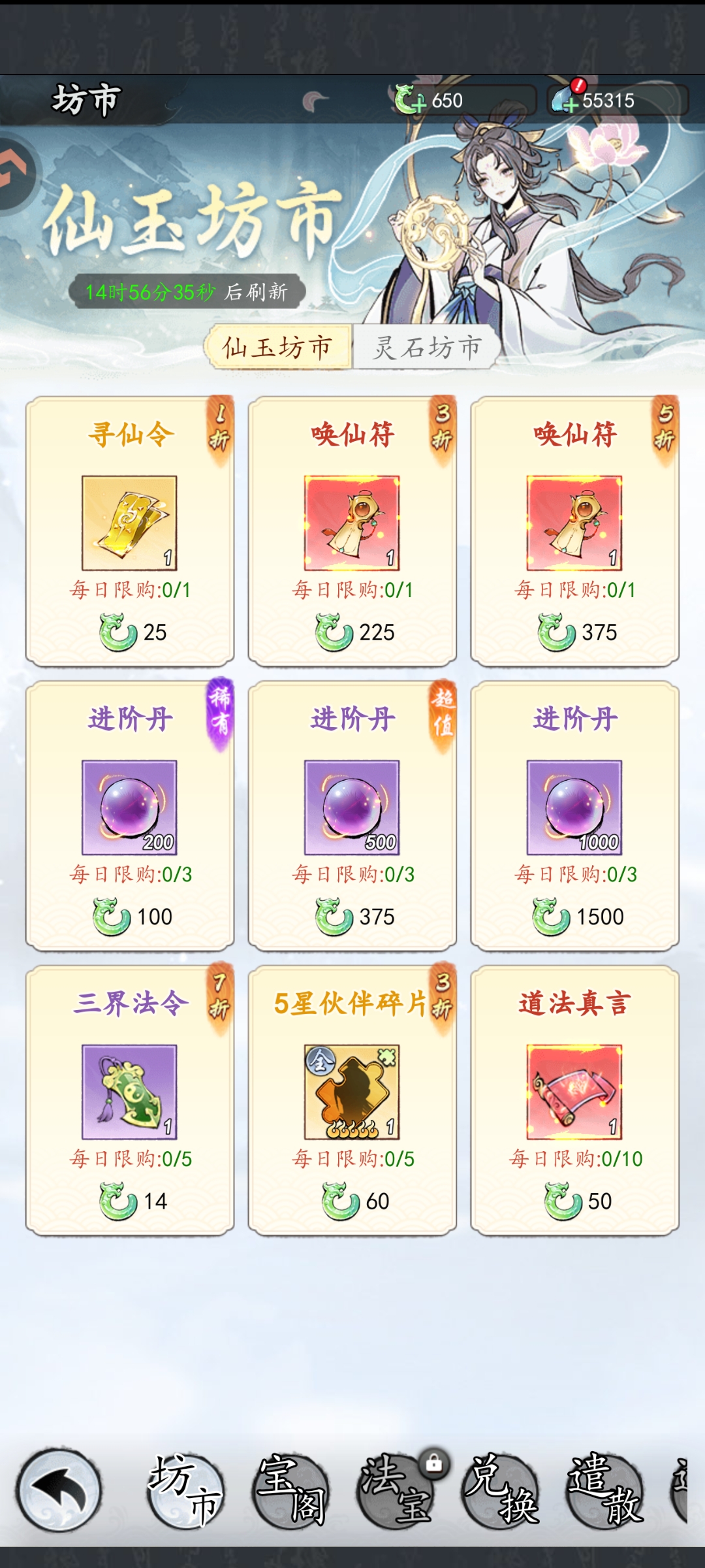 6)仙玉坊市寻仙令、唤仙符、道法真言、进阶丹必买;灵石坊市酌情购买;