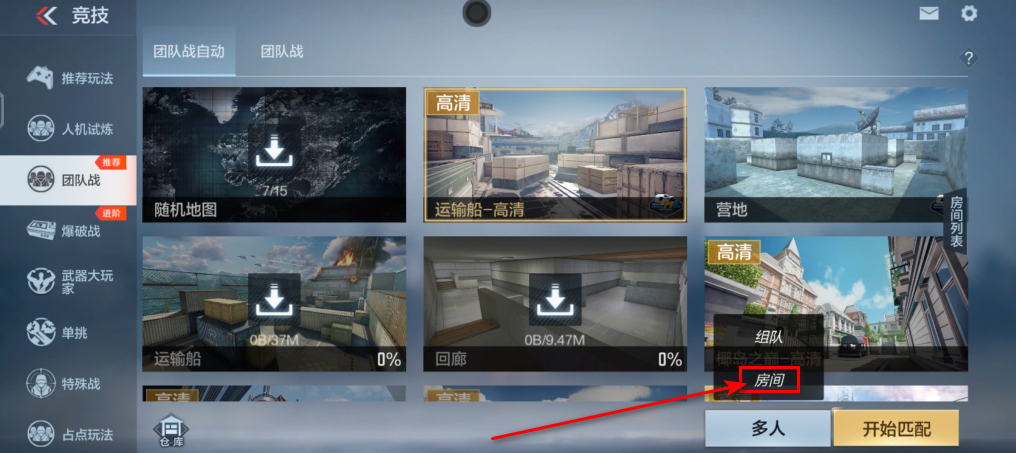 2.然后选好要玩的地图,团队,单挑啥的都可以。