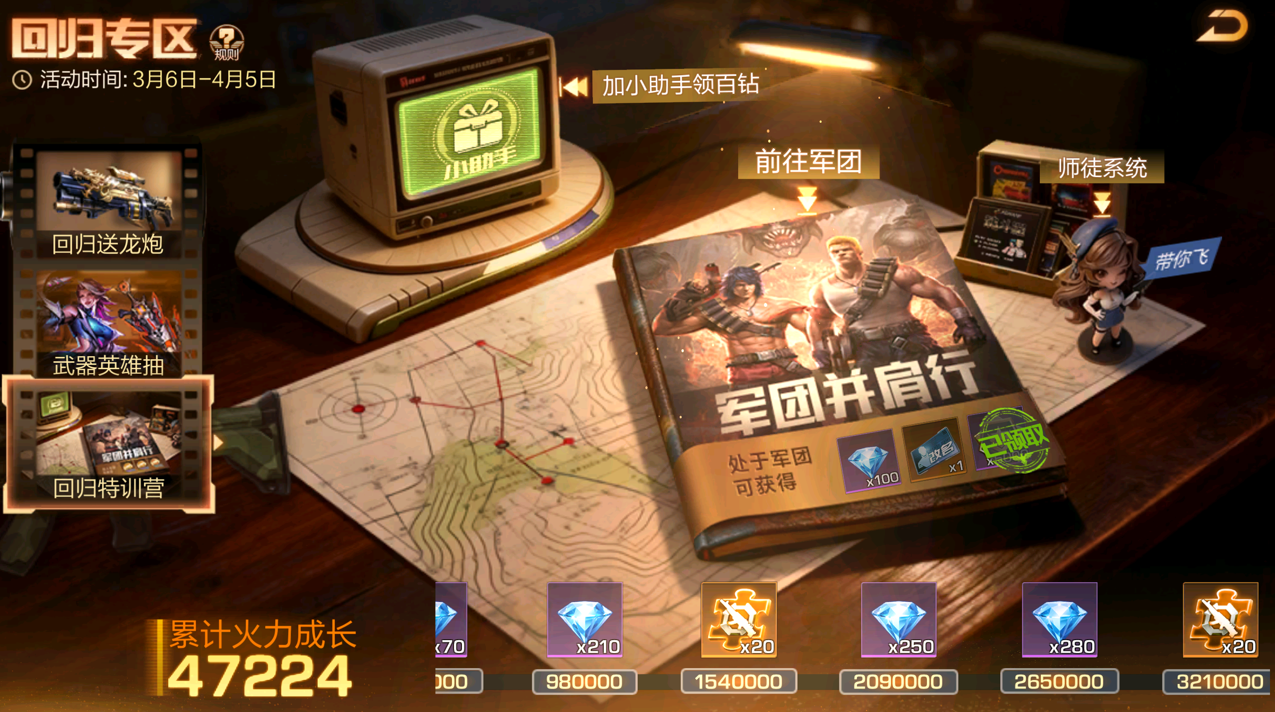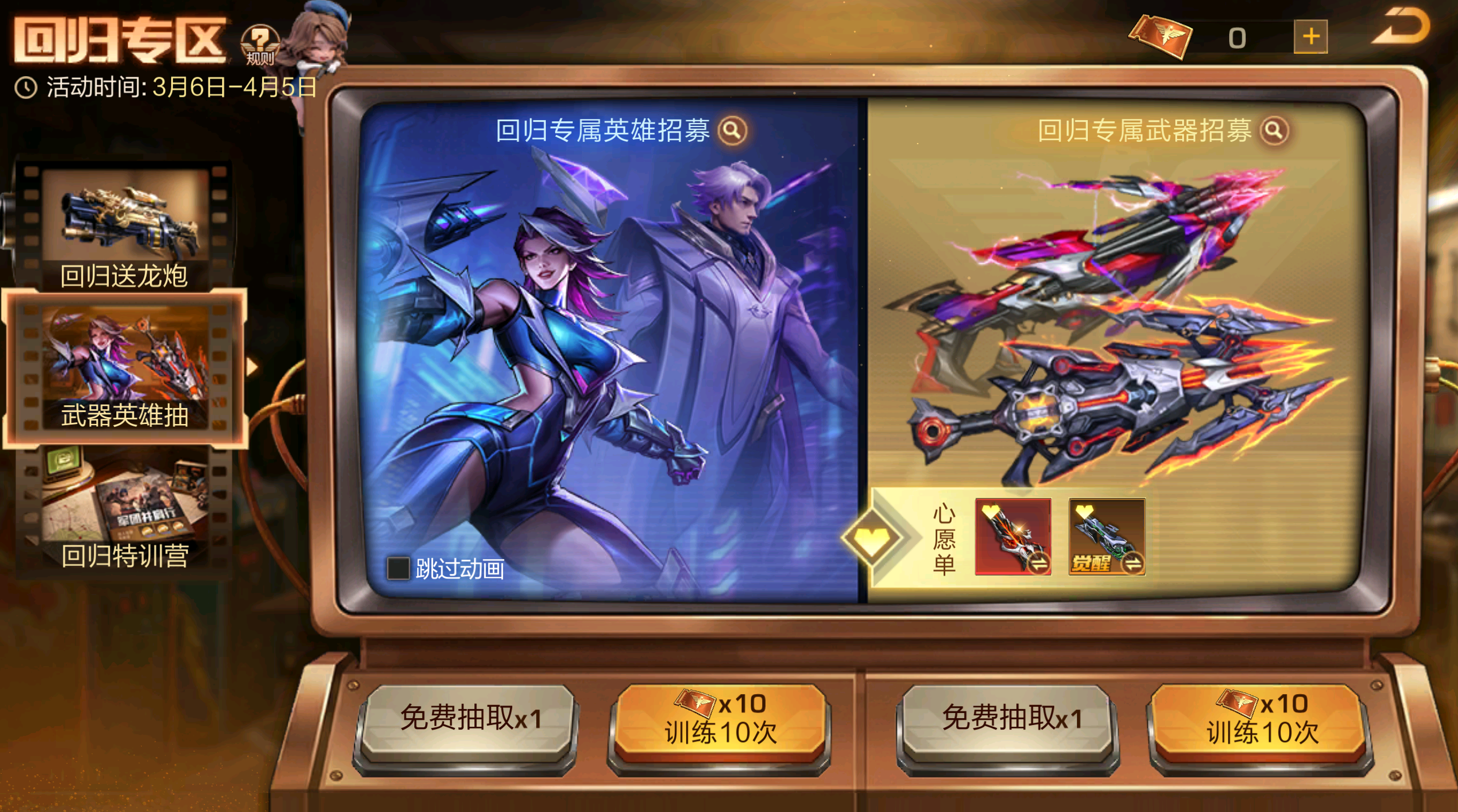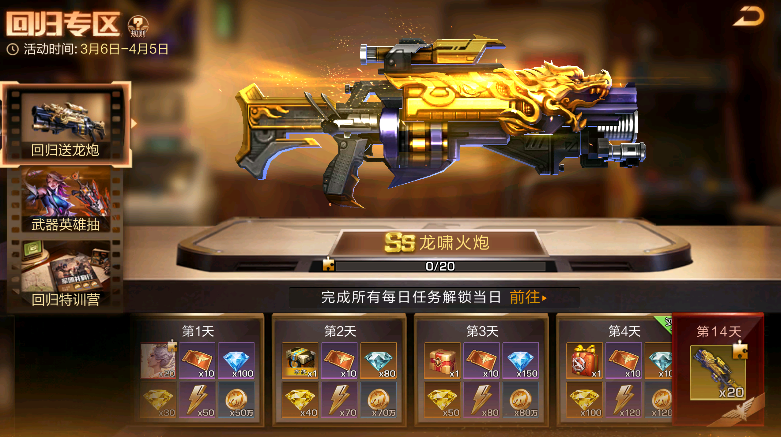 分为【回归送龙炮】【英雄武器抽】【回归训练营】三个模块,给回归老战友提供二星金武、红SS+英雄、金SS+伙伴等充足资源,只需完成每日系统任务即可获得丰厚奖励,通过每日系统任务获得英雄/武器抽奖券,快速补足大量资源,助力重返战场!(温馨提示:在版更期间处于原回归专区开启状态的玩家,会重新触发一期新的回归专区。)