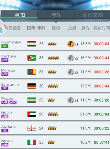 目前球员转会分三类竞拍(绿纱).球探(球探点或金币).金币交易。