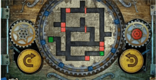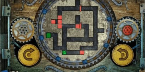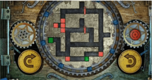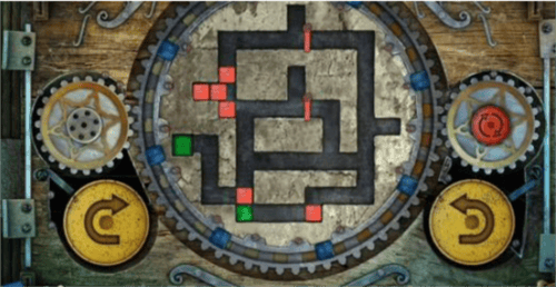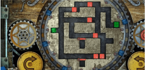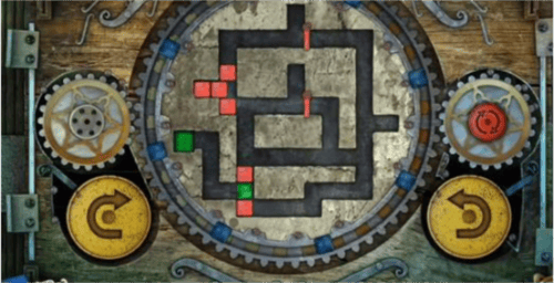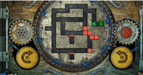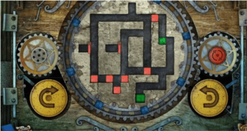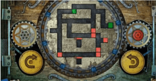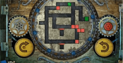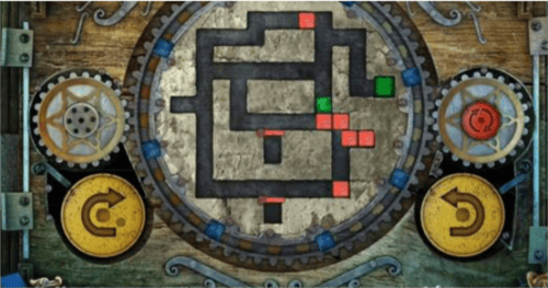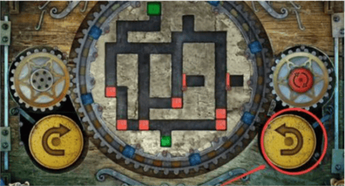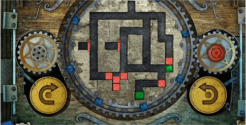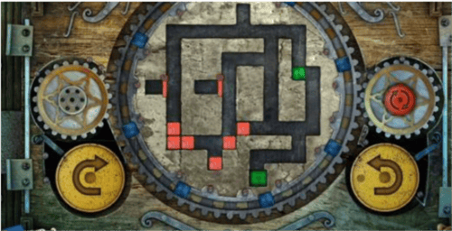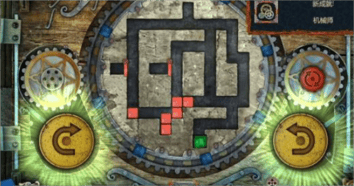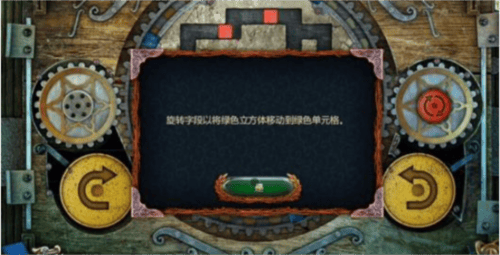 最后,点击左边黄色的旋转按钮一下,中间的大齿轮会顺时针旋转一次,旋转后的立方体位置如图,此时的绿色立方体已经进入了绿色的单元格内,即可通关,门就打开了。