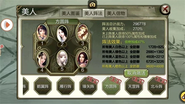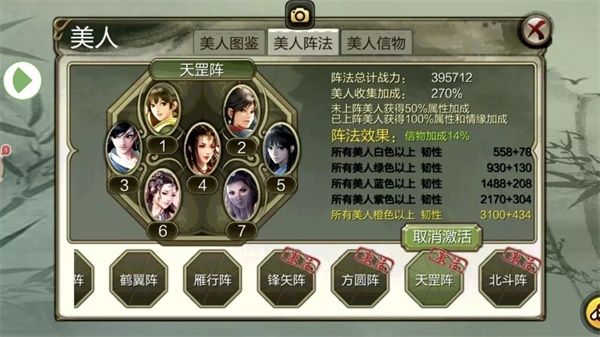 前期阵法没开全时候可以根据职业和需求选择相应的阵法,优先选择上阵美人多的阵法,搭配美人时也应该考虑尽可能多的激活情缘属性。但要注意伤害减免有上限,激活情缘属性时可以优先考虑剩下三条:攻击、防御和生命提高。