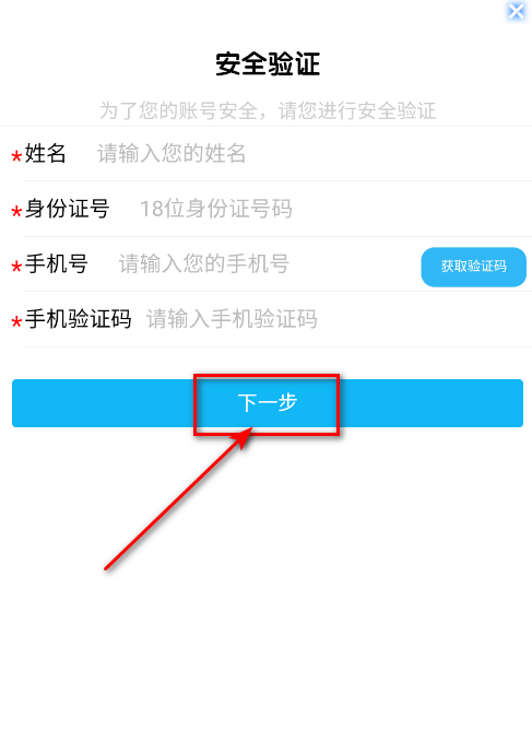 7.输入您注册账号的实名信息的姓名和身份证号,然后就是注册手机号码,填入收到的验证码后,点击下一步。