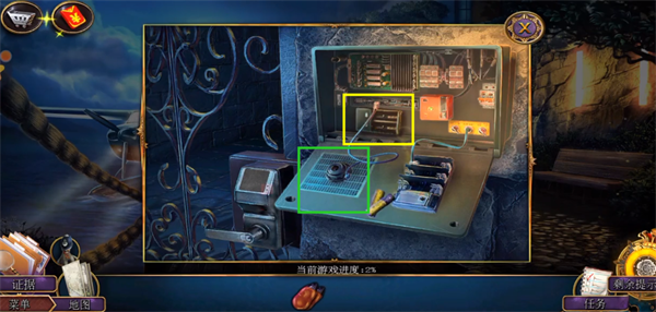 3.下图红框处点击放大后使用之前公文包里的尖嘴钳,打开分电箱,之后分电箱里先点击红框得到电池,之后点击绿框接上线就可以工作,盖上箱子,点击靠左的白色按钮,门打开,前往门厅。