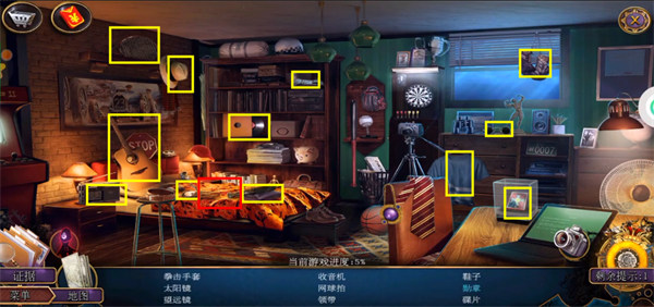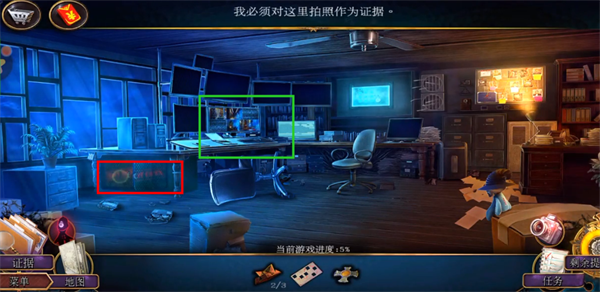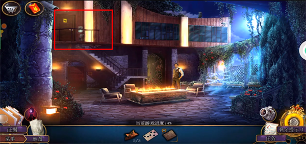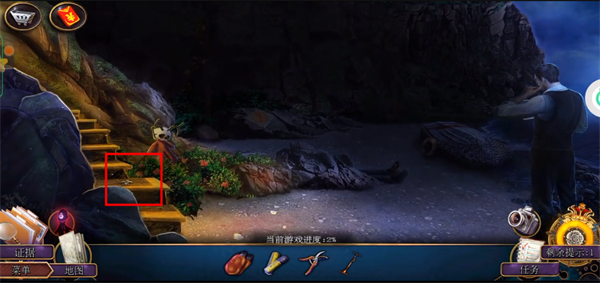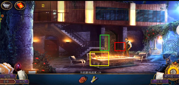 4.进屋后先对话。之后直接右上角前往后院。后院里先点击中间的侦探,拿到红框的照相机,之后点击黄框放大后得到剪枝钳。绿框点击放大后得到门左侧的抽气泵。最后点击灰框处,使用刚刚得到的照相机进行拍摄留下证据,完成教程。