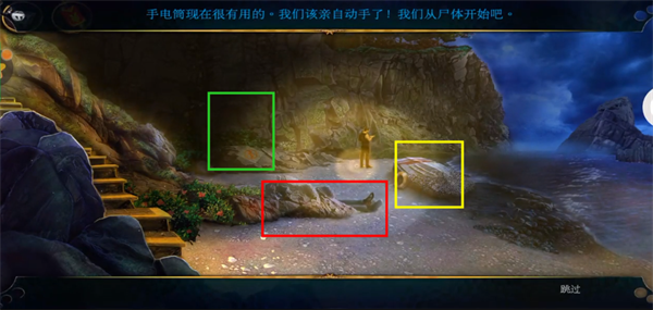7.回到悬崖,对阴影处使用手电筒。先对红框处点击放大后,先对尸体使用照相机留下证据。之后点击尸体头部的布移开后,对尸体脸部使用照相机留下证据。最后点击尸体手上的手表得到证据,之后点击尸体身上的衣服掀开,找到钱包,得到里面的密码图案。之后点击黄框处的小船放大,点击移开救生圈后,对小船左侧有绳子的地方使用充气浮标,之后使用打气筒(抽气泵),多次点击小船后得到马克的钱包,里面有一张纸条进行阅读后得到线索,最后点击钱包左侧,得到卡片。再在绿框处点击放大后使用剪枝钳,得到里面的第二个金字塔碎片