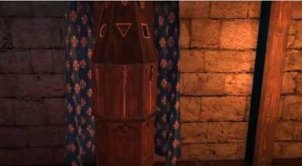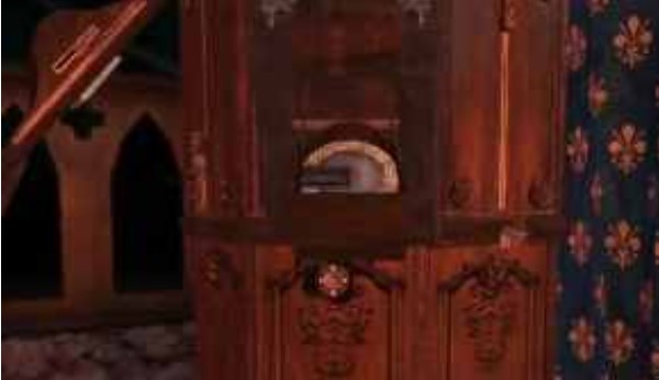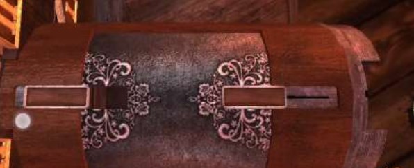 12、来到中心的木桌上,放入金属公羊头,拿到雕刻的金属手柄,回到帘布的大木块头放入金属手柄转动。