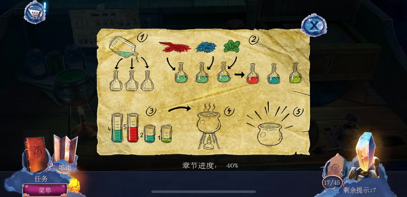 去果园,用坏了的镊子和导线开锁,得到氨水,回小屋,按配方制药,给神兽闻,开箱子,首先得到太阳标志,开锁,得到春天图片,弄成一半花一半树。