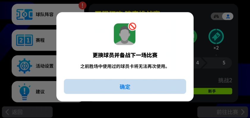 进入下一关后,你在此前获胜的比赛中已经登场过的球员将无法再度登场!考验你阵容深度的时候到了!