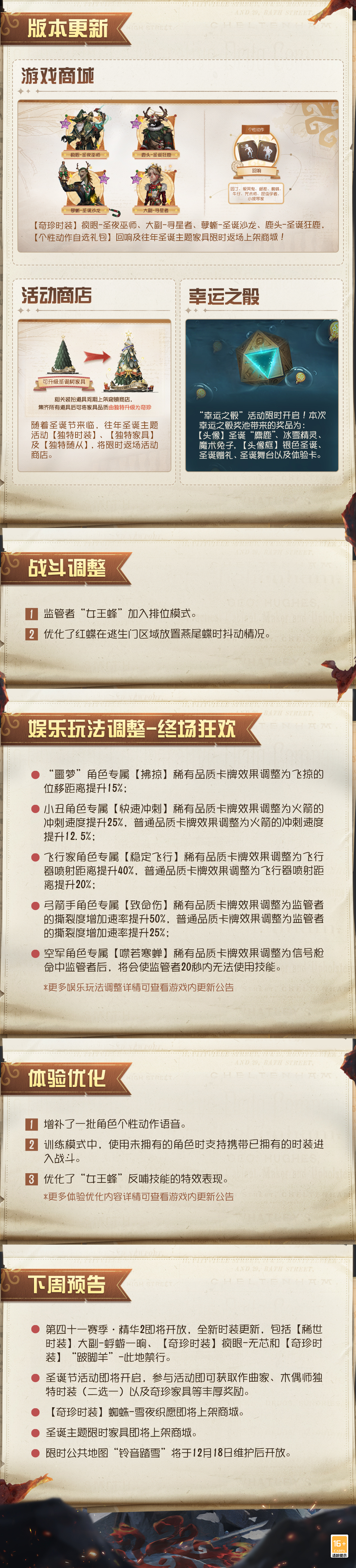 为保证庄园的稳定运行,【第五人格】将于周四上午07:30进行不停服维护。