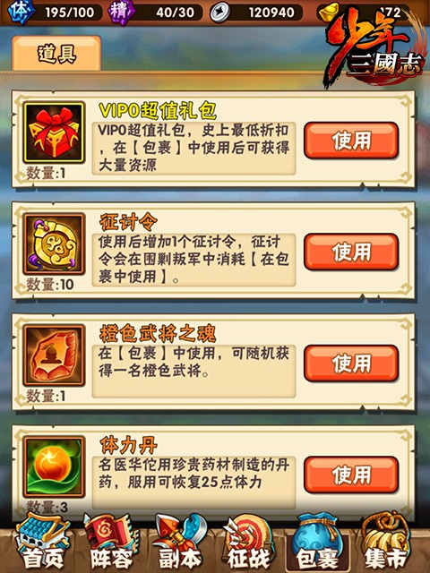 点击“包裹”按钮可以查看你身上所拥有的道具,包括体力丹,精力丹以及各种强化石头等等。