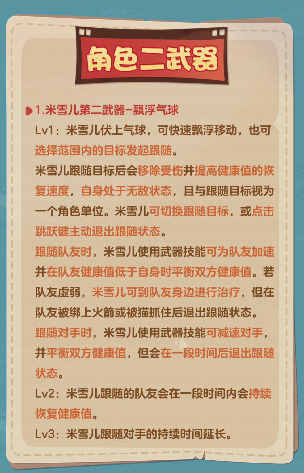 跟随队友时,米雪儿使用武器技能可为队友加速,并在队友健康值低于自身时平衡双方健康值。若队友虚弱,米雪儿可到队友身边进行治疗,但在队友被绑上火箭或被猫抓住后退出跟随状态。