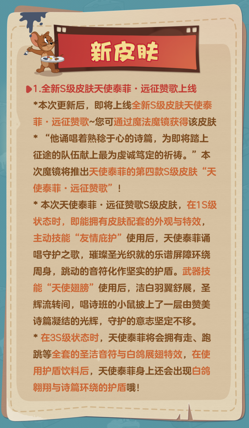*本次天使泰菲·远征赞歌S级皮肤,在1S级状态时,即能拥有皮肤配套的外观与特效,主动技能“友情庇护”使用后,天使泰菲诵唱守护之歌,璀璨圣光织就的乐谱屏障环绕周身,跳动的音符化作坚实的护盾。武器技能“天使翅膀”使用后,洁白羽翼舒展,圣辉流转间,唱诗班的小鼠披上了一层由赞美诗篇凝结的光辉,守护的意志坚定不移。