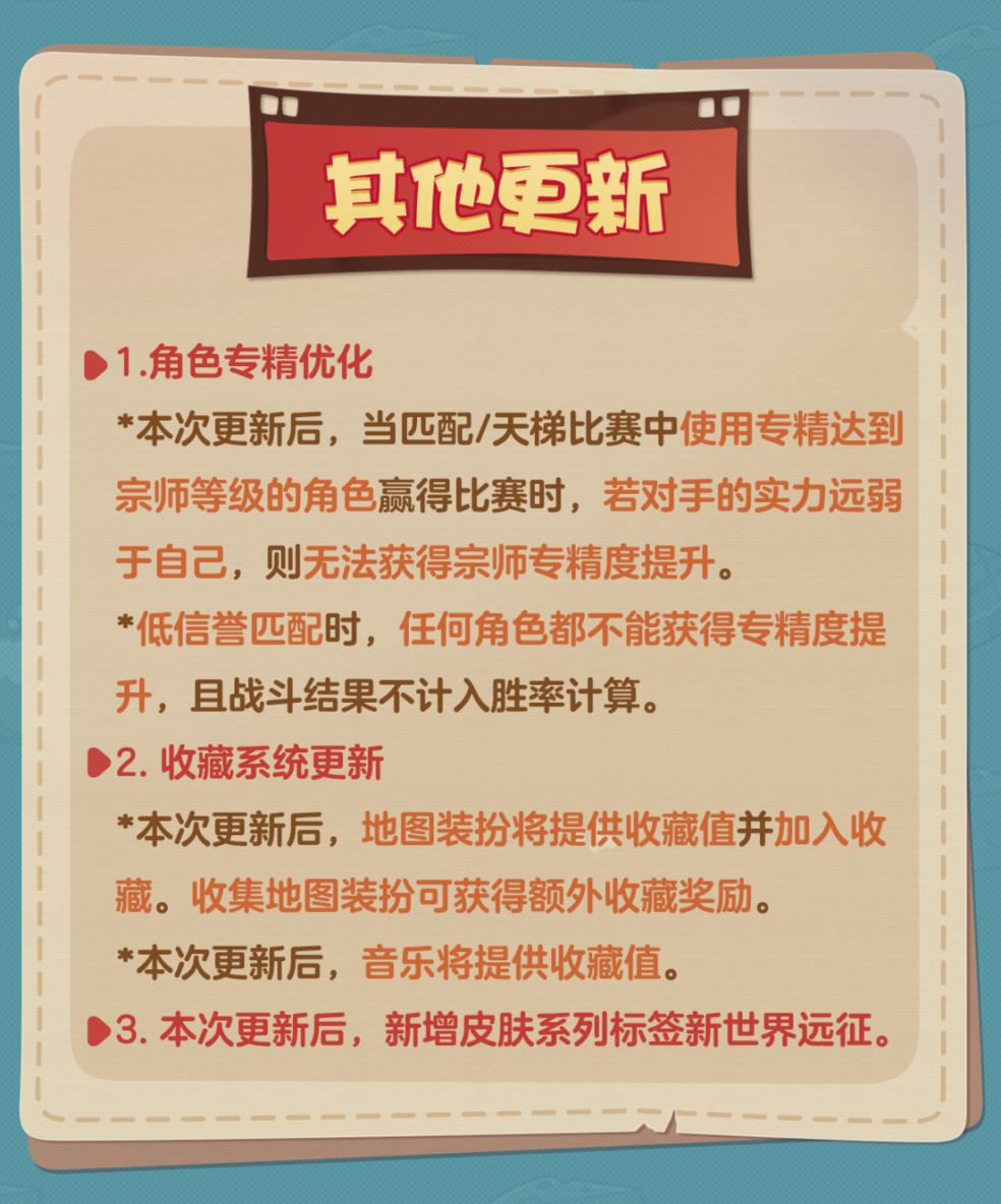 *本次更新后,当匹配/天梯比赛中使用专精达到宗师等级的角色赢得比赛时,若对手的实力远弱于自己,则无法获得宗师专精度提升。