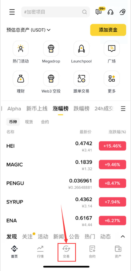 1.请在本站下载安装并打开必安APP后,点击下方的交易。