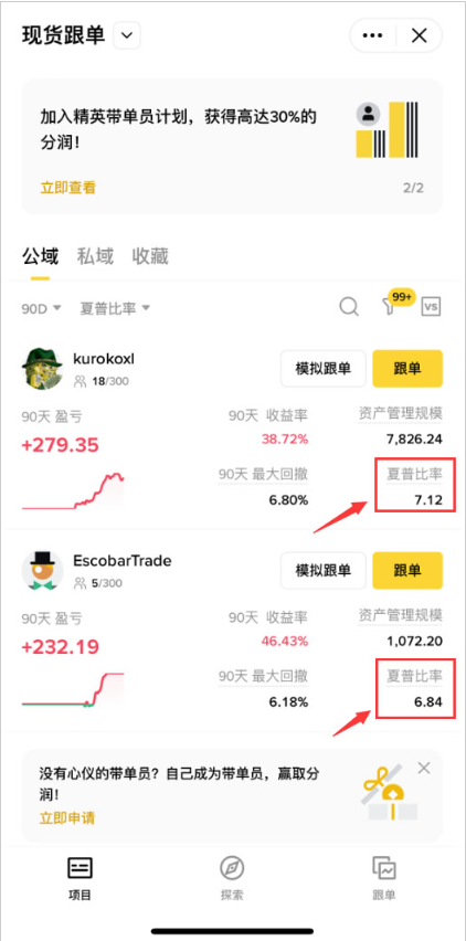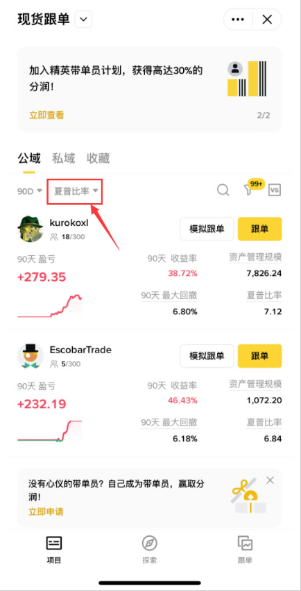 4.后面我默认选的是【夏普比率】。也就意味着,如果这个交易员他自己在交易过程中有盈利有亏损。那么他盈利的部分除以他亏损的部分,其实就是这个交易员自己过往的交易行为,带给他的盈利和亏损之比。只有夏普比率好了,才代表这个交易员的盈利和风险的能力都很好。