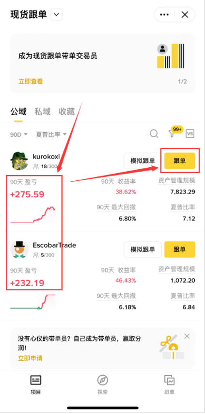 6.之后我们还需要看一看这个交易员的90天盈亏,和90天的回报率之比。你可以看到第一个交易员90天赚了275.59刀,第二个赚了232.19刀,我们就可以跟第一个人来进行跟单。