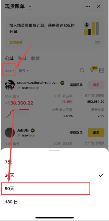 3.首先我们要把天数改为90天。我们不能看某一时某一刻这个交易员的表现,他时间越长,代表这个人越稳定。