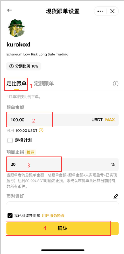 然后,你可以设置一下跟单的金额,这里的“项目止损”指的就是,当这个交易员一共带给你多少比例的亏损的时候,你就不用跟他了。比如说你可以设置成20%,也就意味着,如果这个交易员一共让我亏了本金的20%的话,我就永远不跟他了。如果觉得没有问题,就可以点击【确认】,就可以进行跟单了。