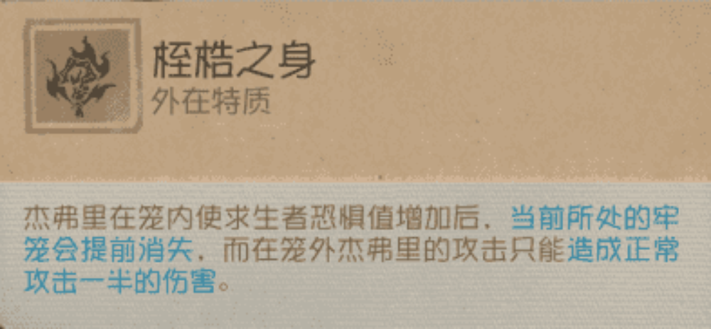 “跛脚羊”在笼内武器攻击键会发蓝光,当“跛脚羊”在笼内使求生者恐惧值增加后,当前所处的牢笼会提前消失,而在笼外“跛脚羊”的攻击只能造成正常攻击一半的伤害。