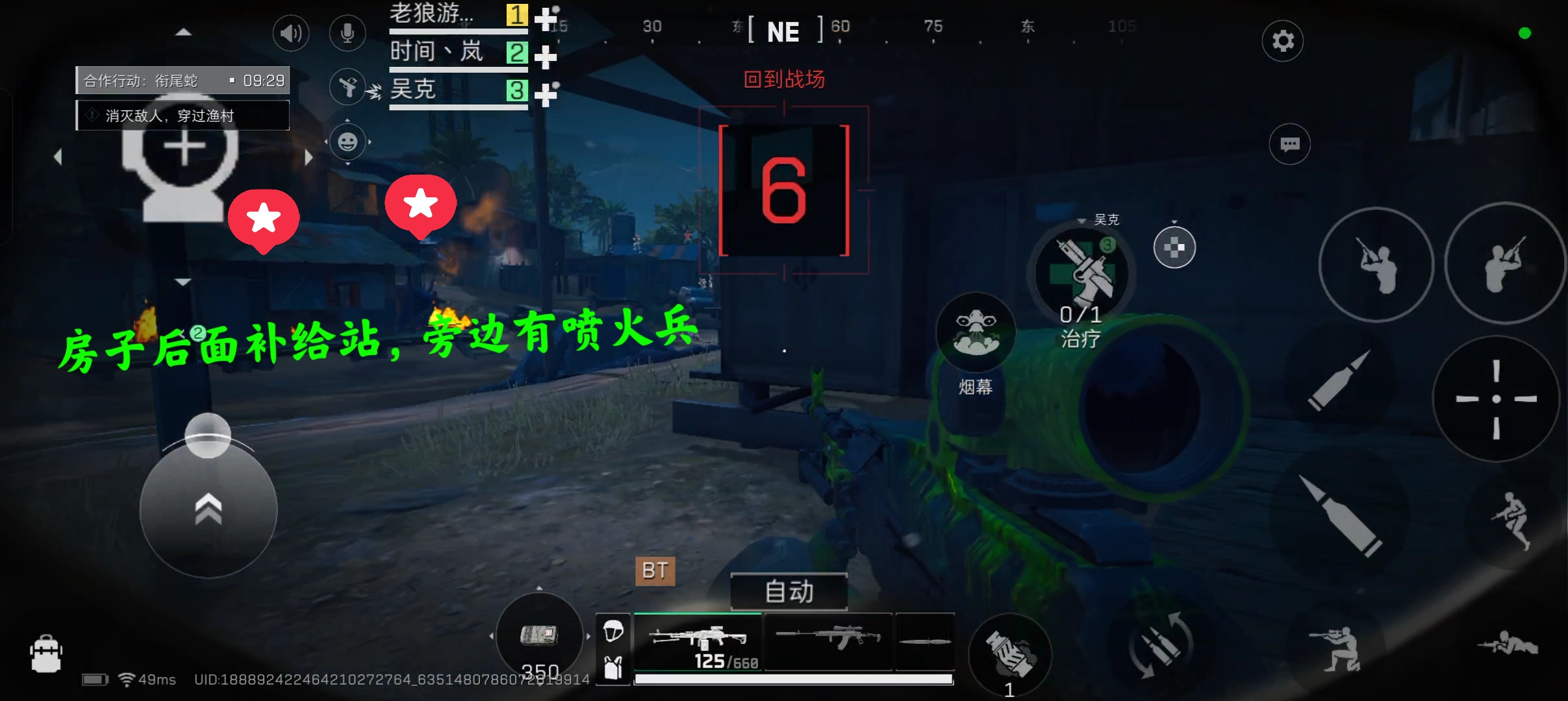 总结:这是整张图最容易翻车的地方,一定要有一个人专门盯着哨塔上的。两个火箭筒兵,两个狙击兵,不停的清,一旦失误,拆炸弹的人会被秒!以上操作需要3人协同配合,所以之后成功率很高!
