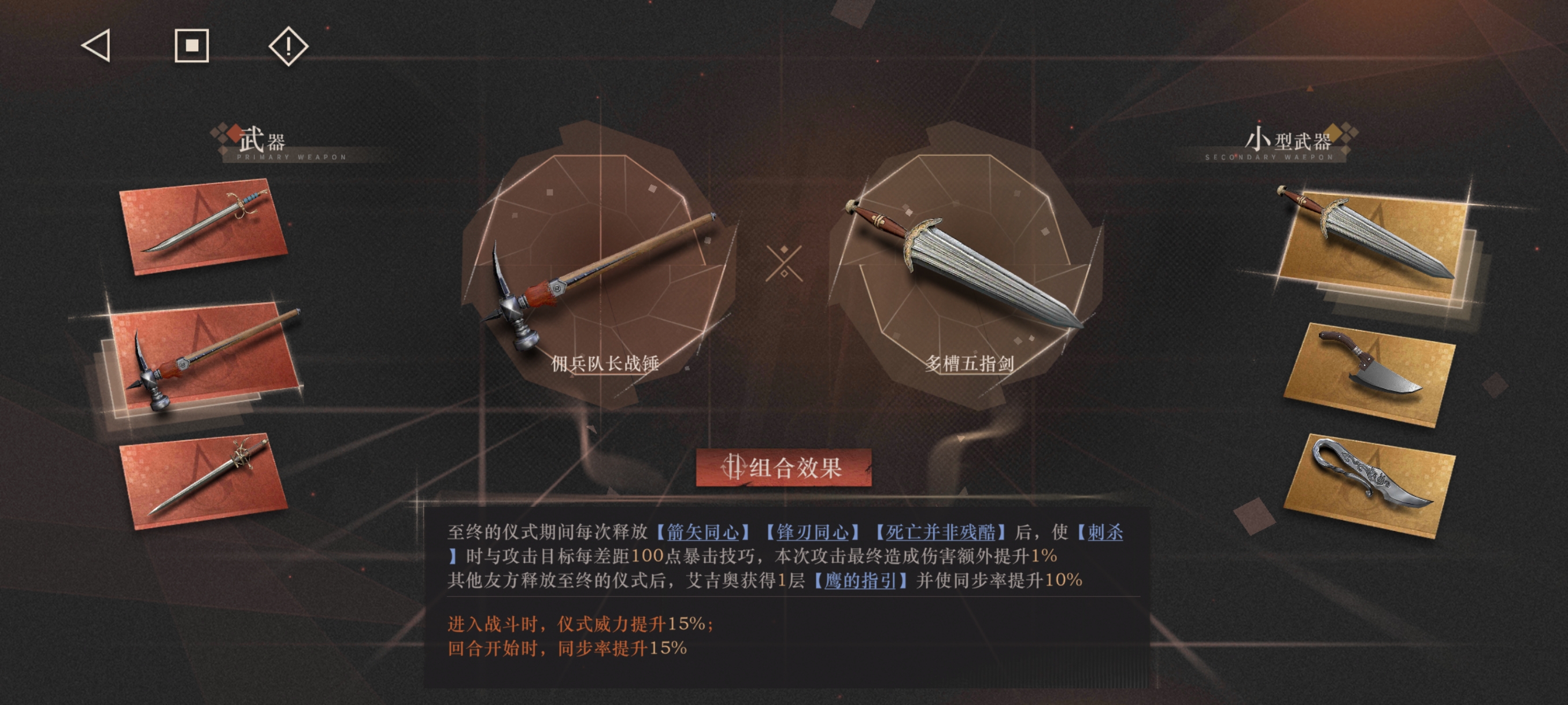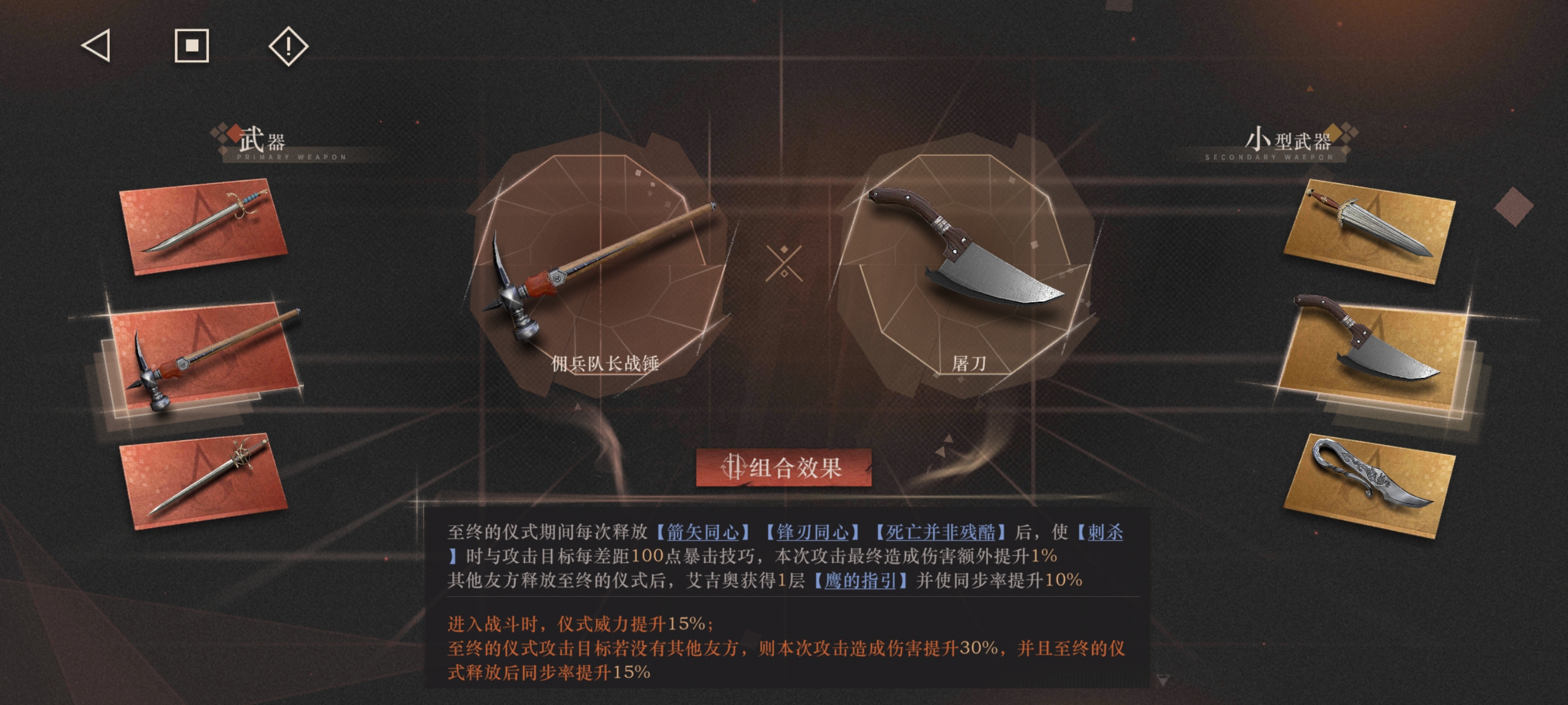 ② 仪式流(佣兵队长战锤+多槽五指剑):加速大招循环,侧重爆发;