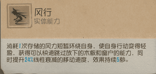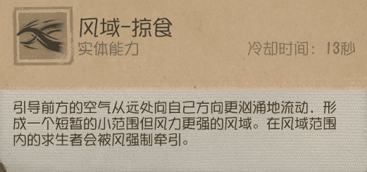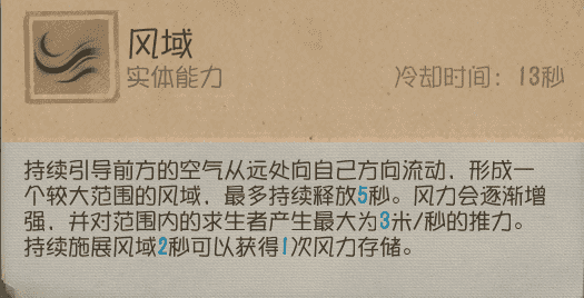 ①【实体能力—风域】和【实体能力—风行】作为守夜人一阶之前就有的技能,他俩可算是相辅相成,【风域】在对求生者进行大规模持续减速的同时会获得1次风力存储,有风力存储便激活了【风行】技能,使得自己在减速别人的同时也可以获得短暂跳跃板窗的加速能力从而能快速击倒求生者。