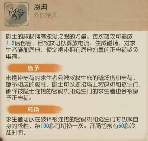 ② 求生者在触摸被连接的密码机或者大门时,只会被赋予正电荷。求生者只有触摸被连接的密码机或者大门时才能切换自身极性,因此隐士可以通过主动切断连接来使求生者无法切换极性帮助队友分摊伤害。