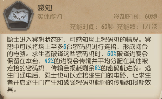 ① 感知是隐士的核心技能,隐士的控场能力就体现在通过感知连接场上密码机,以此大幅度削减求生者的破译进度,并在追击时消耗求生者的道具与状态,为自己后期争取优势与翻盘点。不过需要注意的是,感知的冷却时间为60秒,时间相当长,因此在密码机快要压好的时候一定不能使用该技能,否则在大门通电后将会有很长一段时间无法连接大门从而失去自身的开门战优势。