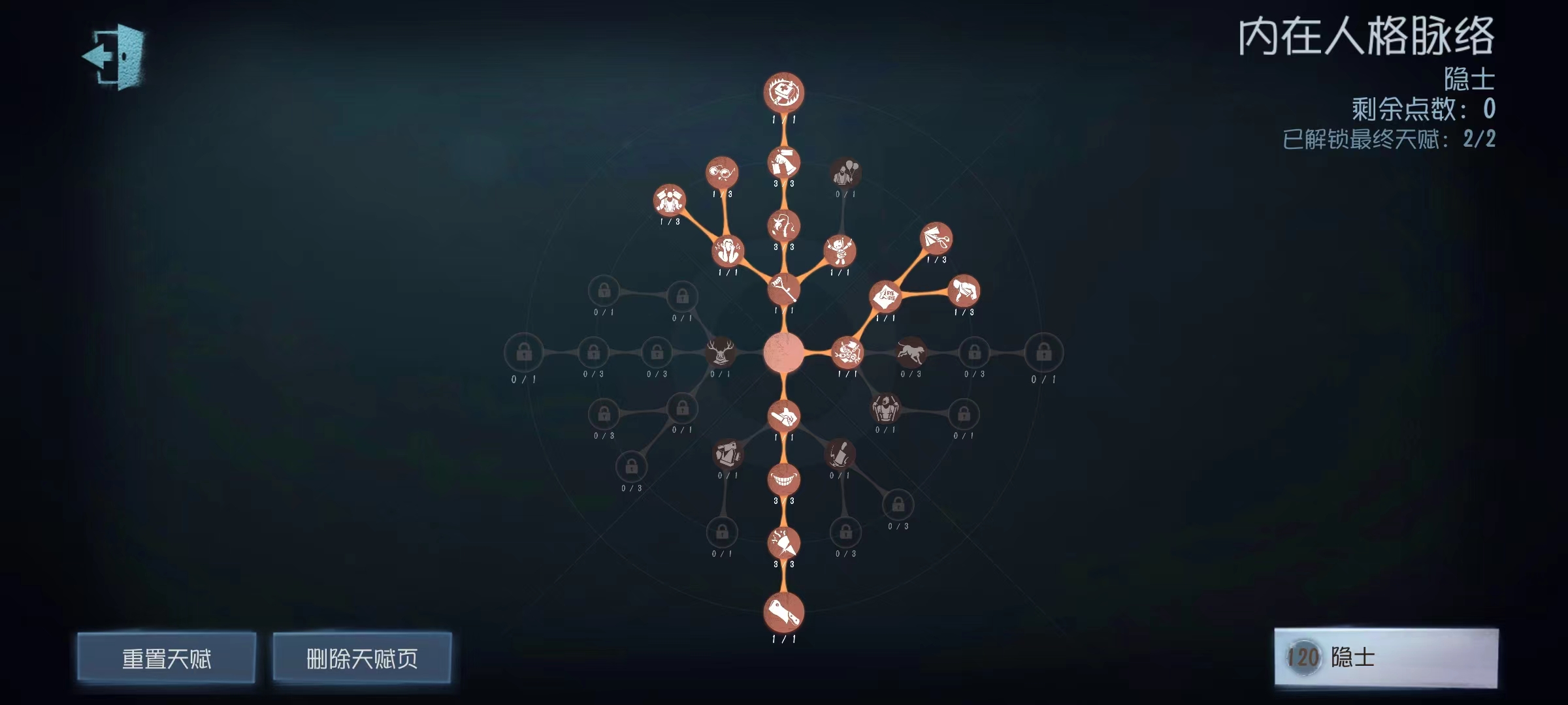 这套天赋仅适用于携带闪现的隐士,在使用【闪现】保证自身终结能力的同时,又能在后期切换【传送】进行控场,能大幅度的提高隐士争胜的能力,唯一的缺陷是踩板速度太慢,只适合板区不太密集的地图携带,当然也可以舍弃别的小天赋去点【破坏欲】提高踩板速度,不过不推荐。